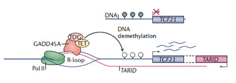 Figure 1. R-loop with antisense lncRNA TARID binds GADD45A, recruits TET1 to the CpG island of TCF21 gene promoter, demethylates the DNA, and activates the TCF21 transcription [4].