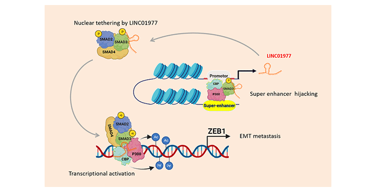 On Arraystar Super-enhancer LncRNA microarray, a super-enhancer was found activated by TGF-/SMAD3 pathway to produce super-enhancer lncRNA LINC01977 [1]. LINC01977 tethers the SMAD2/3/4 complex in the nucleus and transcriptionally promotes the expression of ZEB1, the central switch of the epithelial–mesenchymal transition (EMT) that lead to lung adenocarcinoma progression and metastasis. These results highlight the potential of super-enhancer hijacked lncRNAs as prognostic biomarkers and therapeutic targets for lung cancer.