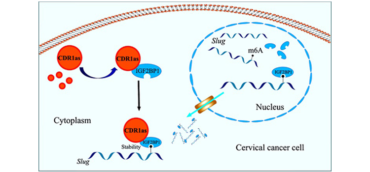 Further, CDR1as facilitates IGF2BP1 to stabilize m6A modified Slug mRNA, a key EMT factor. Additionally, CDR1as activates other TGF-β signaling factors known to promote EMT, including P-Smad2 and P-Smad3. Thus, CDR1as promotes cervical cancer metastasis and shortens cancer survival.
