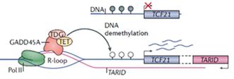 Fig 1.R-loop by antisense lncRNA TARID binds GADD45A, recruits TET1 to the CpG island promoter of TCF21 gene, and demethylates the DNA, activating the TCF21 transcription [1].