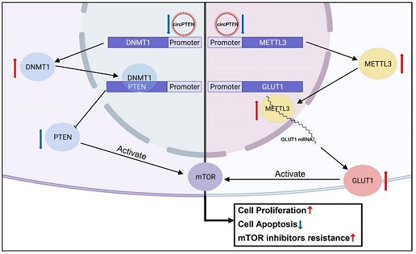 circPTEN circular RNA was discovered down regulated in clear cell renal cell carcinoma (ccRCC) on Arraystar circRNA Microarray [1]. circPTEN regulates DNMT1 which epigenetically controls tumor suppressor PTEN gene expression (Fig. 1, left), and METTL3 which epitranscriptomically modifies glucose transporter GLUT1 mRNA (Fig. 2, right). Both mechanisms suppress the kidney cancer and mTOR inhibitor cancer drug resistance via mTOR pathway.