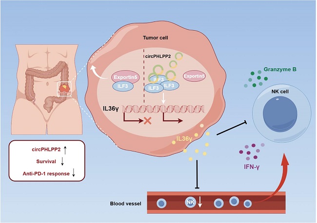 Fig. 1. circPHLPP2 facilitates colorectal cancer by its interaction with ILF3, enhancing IL36γ expression, and ultimately reducing NK cell cancer immunity and promoting cancer growth [1].