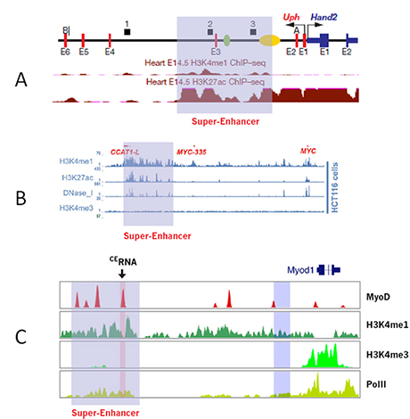 Figure 1. Examples of SE-lncRNAs and their nearby genes. (A) SE-lncRNA upperhand (Uph) and its target gene Hand2, a key transcription factor in cardiomyocyte differentiation [1]. (B) SE-lncRNA CCAT1-L and its target gene MYC, an oncogene in colorectal cancer [2]. (C) SE-lncRNA Core Enhancer RNA (CERNA) and its target gene MyoD, a master transcription factor in myogenesis [3].