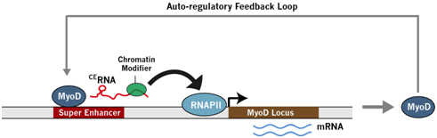 Figure 2. SE-lncRNA regulating the nearby gene expression. MyoD is the master transcription factor in myogenesis, controlling other key transcription factors during the myogenic gene expression program. Upon myogenic stimulation, MyoD,the core enhancer (CE) in the super-enhancer upstream of the MyoD gene transcribes a SE-lncRNA CERNA. CERNA recruits activating chromatin modifier to open up the chromatin and also increases the RNA polymerase II loading to the MyoD promoter, leading to MyoD upregulation. MyoD further activates its own CERNA, forming a positive auto-regulatory feedback loop [3, 4].