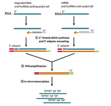 To accurately detect and quantify the transient, low level SE-lncRNAs, Arraystar scientists have developed an efficient and robust linear amplification method to generate ample fluorophore-labeled cRNA for both polyadenylated and non-polyadenylated transcripts. In this method, an optimized mixture of oligo(dT) and random primers, each containing a T7 polymerase promoter, is annealed to the RNA. The cDNA is synthesized by reverse transcription followed by 5’ adapter annealing and PCR amplification. Finally, cyanine 3- or cyanine 5-labeled cRNA is synthesized by in vitro transcription from the T7 promoter by T7 RNA polymerase (Figure 1).