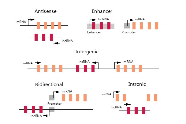 Figure 1 | Classification of lncRNAs based on genomic locations. Antisense lncRNAs are transcribed from the antisense strand and overlap with the protein-coding gene sequence. Enhancer lncRNAs are located in enhancer regions. Intergenic lncRNAs are transcripts located from protein-coding genes at distances of more than 1~5 kb. Bidirectional lncRNAs are transcribed within 1 kb of promoters of the protein-coding transcript in the opposite direction. Intronic lncRNAs are derived from the intron of a coding gene.