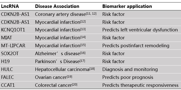 It is now widely understood that lncRNAs could identify cellular pathologies, provide diagnostic/prognostic value, or even inform therapeutic options. Spatial, temporal, and disease-associated regulation of expression suggests that lncRNA can be powerful and effective biomarkers. The tissue and cell type specificities of lncRNAs are much higher than mRNAs [21]. Numerous studies have demonstrated the biomarker utilities of lncRNAs (Table 1). For example, LncRNA MT LIPCAR is differentially expressed in left ventricular remodeling and heart failure, as validated in 788 patients. High circulating levels of MT LIPCAR independently predicted adverse cardiac remodeling not confounded by other predictive markers of cardiovascular death.