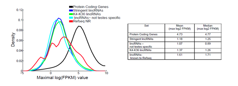 Figure 1. Density distributions of maximal expression abundance across all tissues. The log2 normalized FPKM counts are estimated by Cufflinks, showing stringent lincRNAs (blue), stringent lincRNAs with K4-K36 support (green), stringent lincRNAs which are not testes-specific (cyan), lincRNAs known to RefSeq NR (red) and protein-coding genes(black). The mean and median of maximal expression scores are presented in the table on the right [4]. The fold difference between the protein coding genes and lncRNAs can be converted from the difference of their log2FPKMs as 2Dlog2(FPKM).