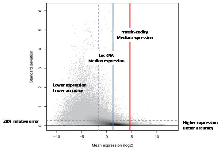 The relationship between gene expression level and measurement precision was studied and characterized in datasets using three technical replicates containing 331 million 50bp reads each [9]. As seen in Figure 3, the higher the gene expression level, the more precise the measurement. Conversely, the lower the gene expression level, the higher the relative error in the measurement.  As LncRNAs are expressed at levels much lower than that of protein coding genes, a signification proportion of the lower abundance LncRNAs cannot be precisely quantified for their expression by RNA-seq (relative error greater than 20%).