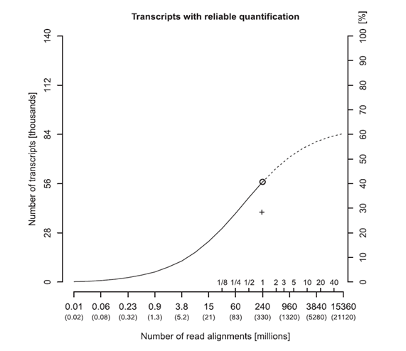 Figure 4. Transcripts with reliable quantification with a relative error of 20% or less versus read depth. The total number of generated reads is given in parentheses below. Additional inside tick marks indicate the number of sequencing runs worth of sequencing. The alternate y-axis on the right shows the percentage of all known transcripts measured reliably. The circle symbol indicates reads (331 million reads) in an entire sequencing run. Extrapolation of the fitted sigmoid curve suggests a maximum of 60% even at reads of 10 billion.