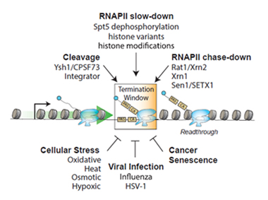 Figure 2. Regulation of transcription termination by the factors, mechanisms, or cellular conditions that promote (Top) or impair (Bottom) RNAPII transcription termination. Transcription termination defects caused by cellular stress, viral infection, cancer, and senescence can result in read-through transcription and DoG production.