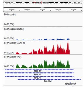 Figure2. MALAT1 rG4 signals from G4RP-Seq for biotin control, untreated, BRACO-19-treated, and RHPS4-treated samples [3]. While treatment with G4-stabilizing ligands BRACO-19 or RHPS4 produces high rG4 signals, the rG4s are artificially induces and stabilized G4s [1], not representing the native transient rG4 states in vivo and not ideal for observing the natural rG4s under normal physiological conditions.