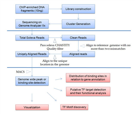 Our ChIP-seq generates around 10 million uniquely aligned reads per ChIP-DNA sample. In order to identify the protein binding sites from ChIP-seq data, we use Model-based Analysis of ChIP-Seq (MACS) to predict the protein-DNA interaction sites. This is useful for ChIP-seq peak detection without the use of controls. MACS provides detailed information for each peak, such as genome coordinates, p-value and summits (peak center). The discrete regions of 150 bp around each ChIP-seq peak are defined as protein binding sites.