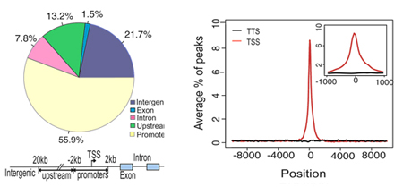 By mapping the binding sites in relation to Refseq genes, we can provide the annotation and distribution of TF binding sites across five different categories of genomic elements including the promoter, exon, intron, upstream and intergenic regions. TF binding profiles around TSS (Transcription Start Sites) are also provided.