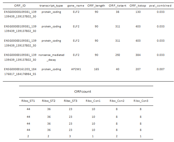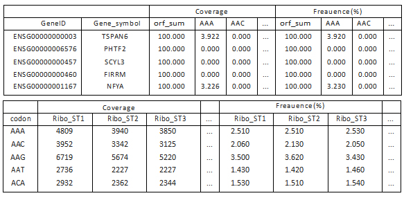 Table 2. Codon coverage analysis results. Top: RPF coverage on each codon in the gene and corresponding proportions. Bottom: RPF coverage on each codon and corresponding proportions.