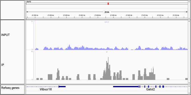 Fig 3. ChIP-Seq signals of IP and input are visualized together in the IGV software.