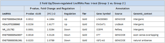 Table 1. Differentially expressed LncRNAs with systematic lncRNA annotations. Differentially expressed LncRNAs (Fold change>2, p-value<0.05) in Group1 vs Group2. In column “Regulation”, “Up” indicates up-regulated, “Down” indicates down-regulated.