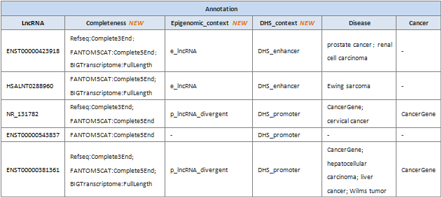 Complete with genomic information, epigenomic context, subclassification, transcript model completeness, subcellular localization, miRNA recognition, conservation, tissue/cell specificity, and small peptide coding potentials, biological process, and disease association, for gaining insights into the complex lncRNA biology.