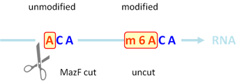 Figure 1. MazF enzyme cuts at unmethylated (ACA) sequence but not methylated (m6ACA).