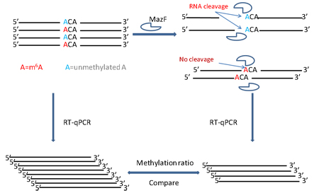 RNase MazF has the enzymatic property to cleave single stranded RNA 5’ immediate to the unmethylated (ACA) sequence, but not methylated (m6ACA) (Fig. 1). RNA treated with MazF and the input RNA without MazF digestion are then quantified by qPCR to determine the extent of m6A modification (Fig. 2).