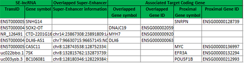 • Detailed annotations for SE-lncRNA, super-enhancer, and targets >>