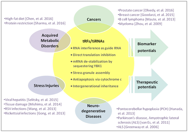 tRFs and tiRNAs, generated through precise biogenesis processes from tRNA, perform many biological functions as small noncoding RNAs and are associated with many diseases and conditions (Fig.1) . They are known to act as microRNAs in RNA interference; bind protein factors to regulate target mRNA stability; interact with cytochrome c to modulate apoptosis; alter embryonic transcriptional cascades as paternal epigenetic factor in intergenerational inheritance of metabolic disorders; and assemble stress granules in response to stress conditions.
