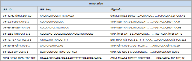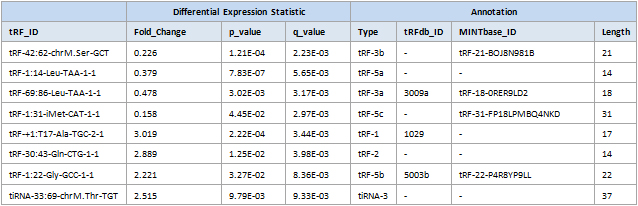 Figure 1. Differential analysis data tables with detailed annotation of tRF&tiRNA sequences, type, length and cleavage sites in tRNAs.