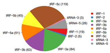 Figure 2. The distribution of tRF & tiRNA subtypes. The colors represent the tRF & tiRNA subtypes. The values in brackets represent the numbers of tRF & tiRNA subtypes.